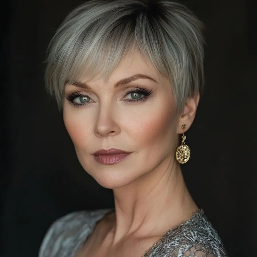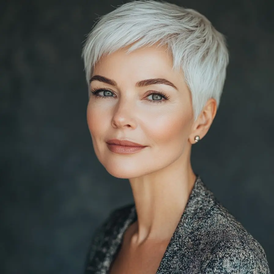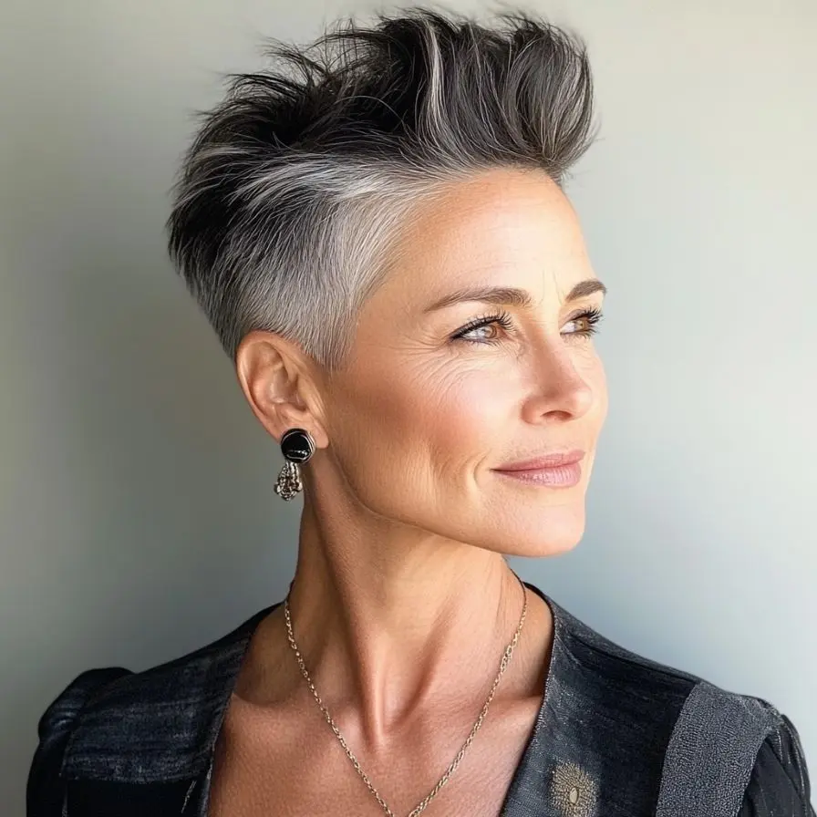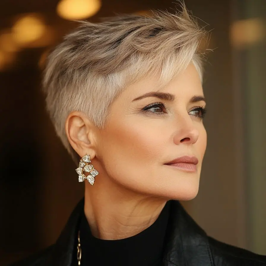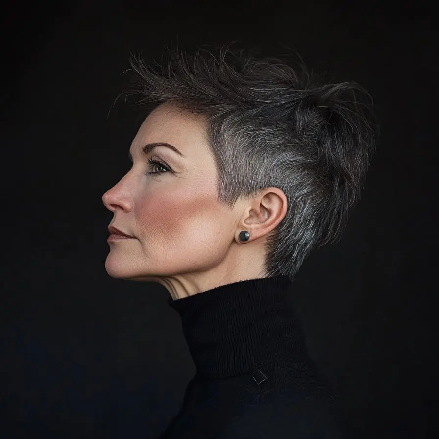 This cut is incredibly low-maintenance yet makes a dramatic impression. The shaved sides create a sleek contour that accentuates the jawline and neck, while the longer top layers allow for creative styling—whether slicked back, tousled, or swept to the side. As one of the boldest choices among Pixie and Edgy Hairstyles for Women Over 50, the Shaved Side Pixie Cut delivers a powerful message: confidence knows no age.