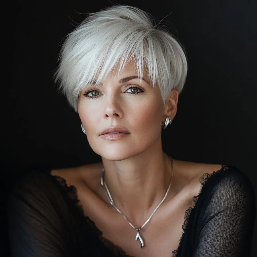 What makes this look so striking is the contrast between the sharp cut and luminous color. The platinum hue brings brightness to the face, enhances the eyes, and beautifully complements natural grey hair, making it one of the most empowering Pixie and Edgy Hairstyles for Women Over 50. It’s also a fantastic choice for women with cool undertones in their skin, as the icy shade naturally lifts and illuminates the complexion.