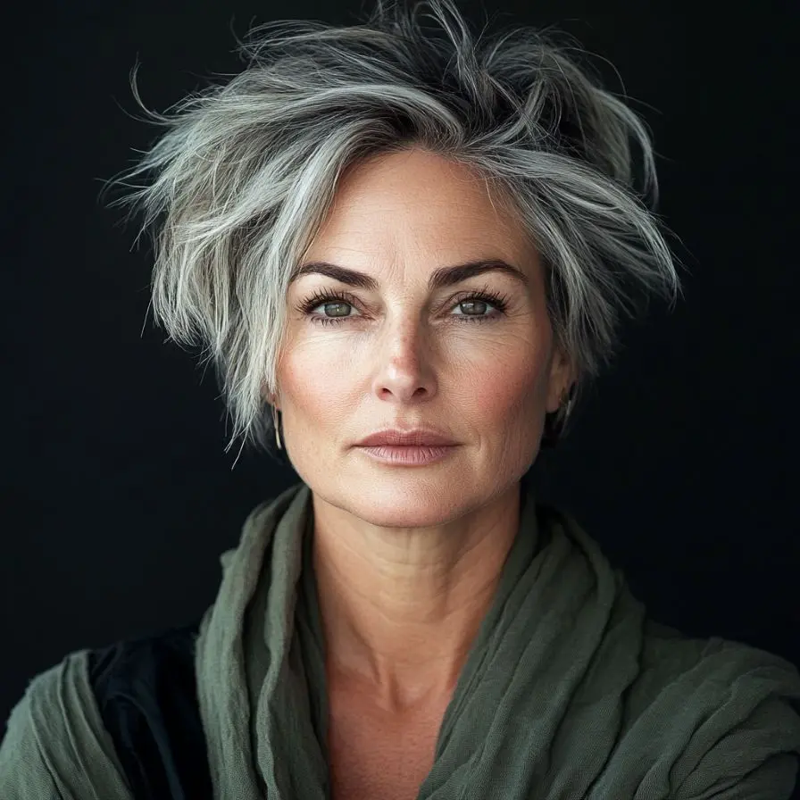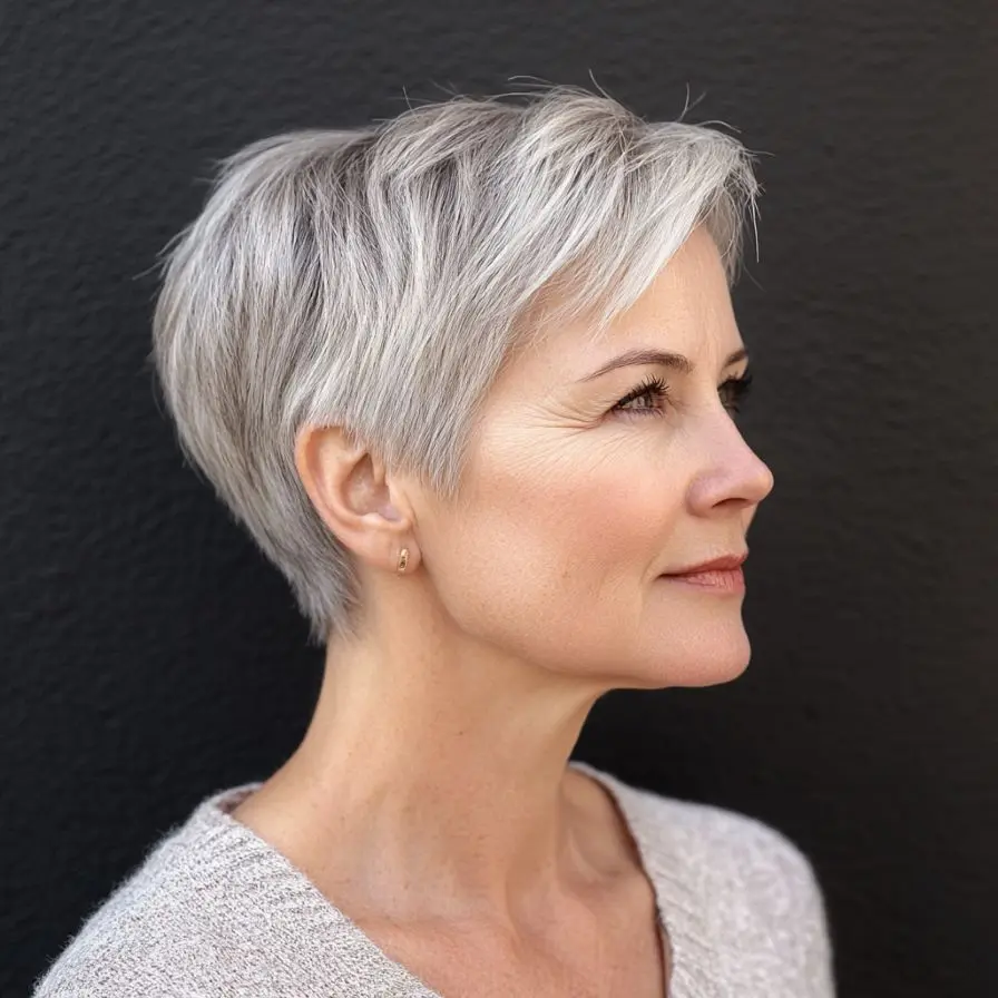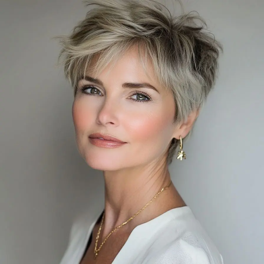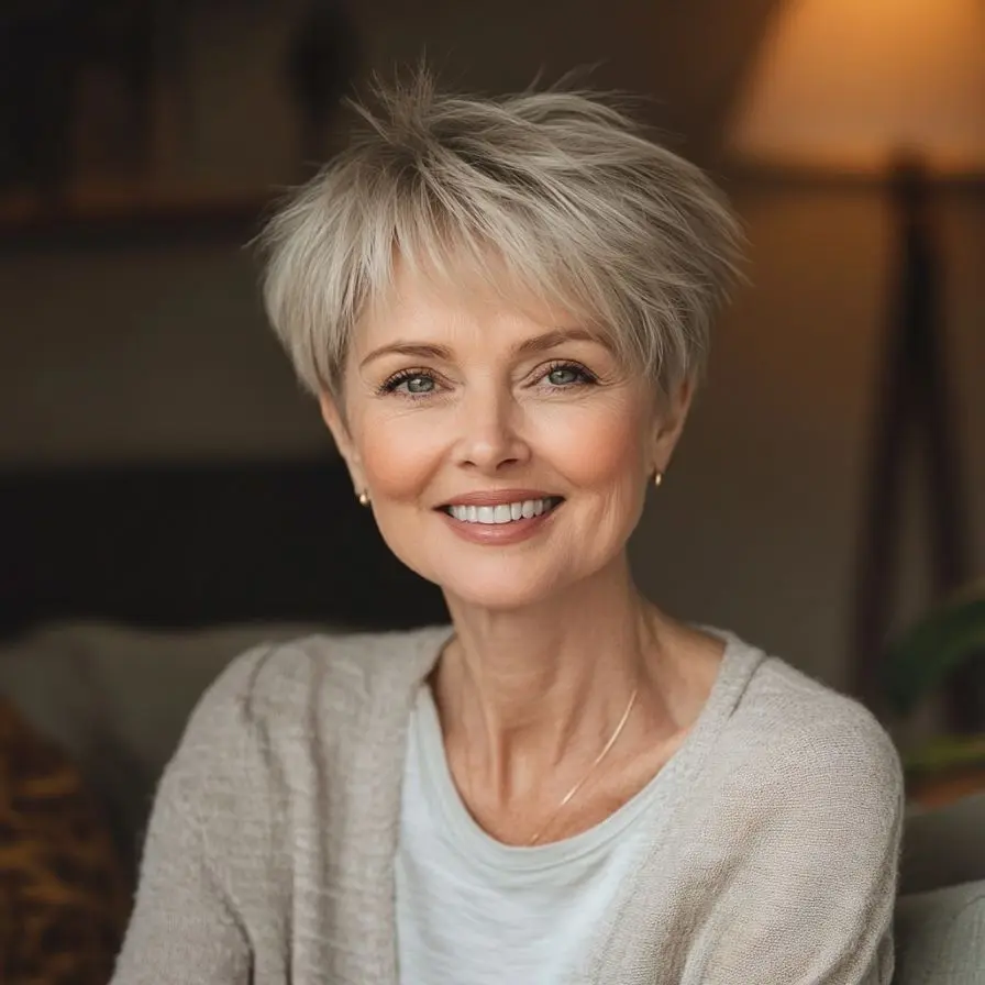 For those exploring hairstyles for thin hair over 50 women, this pixie style delivers both personality and practicality. The soft, shaggy edges give a more relaxed appearance, while the subtle layering adds dimension and movement. It’s especially flattering on women with oval or heart-shaped faces, drawing attention to the eyes and cheekbones.