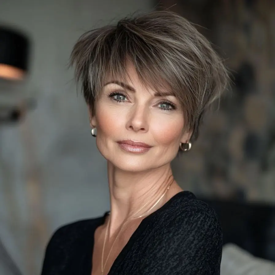 Among the most dynamic hairstyles for thin hair over 50 women, this pixie variation is perfect for highlighting facial features and adding a modern twist to mature looks. The long bangs can be worn to the side, pinned back, or slightly tousled for different moods—making it a truly adaptable style.